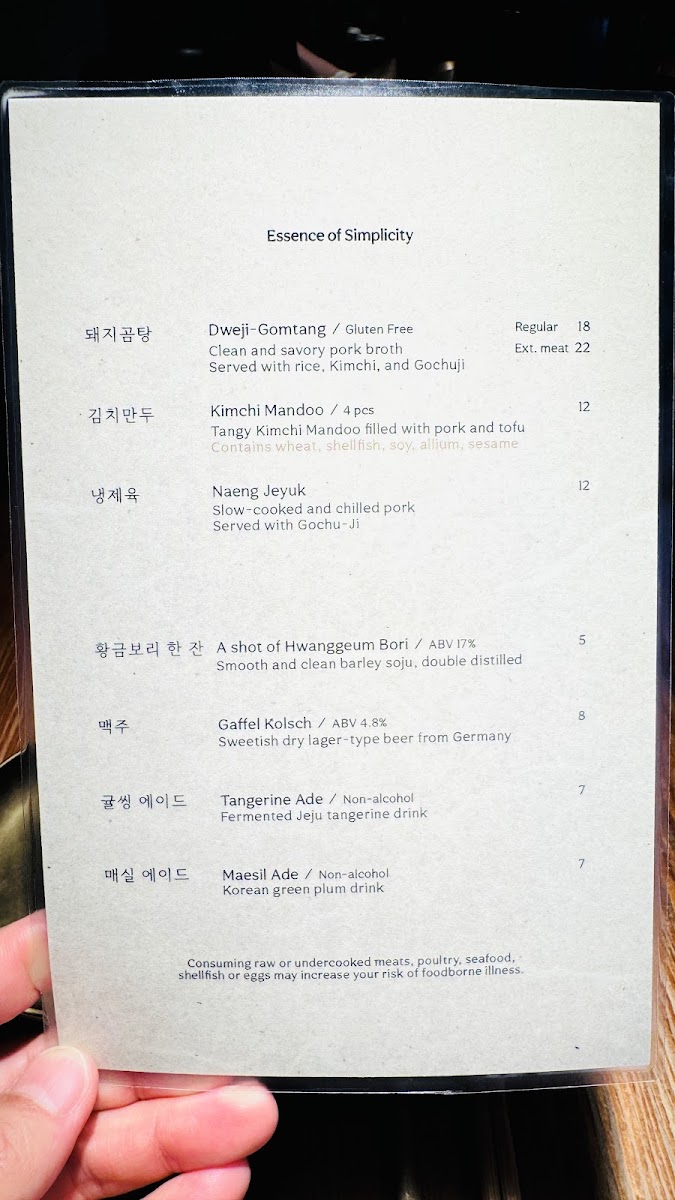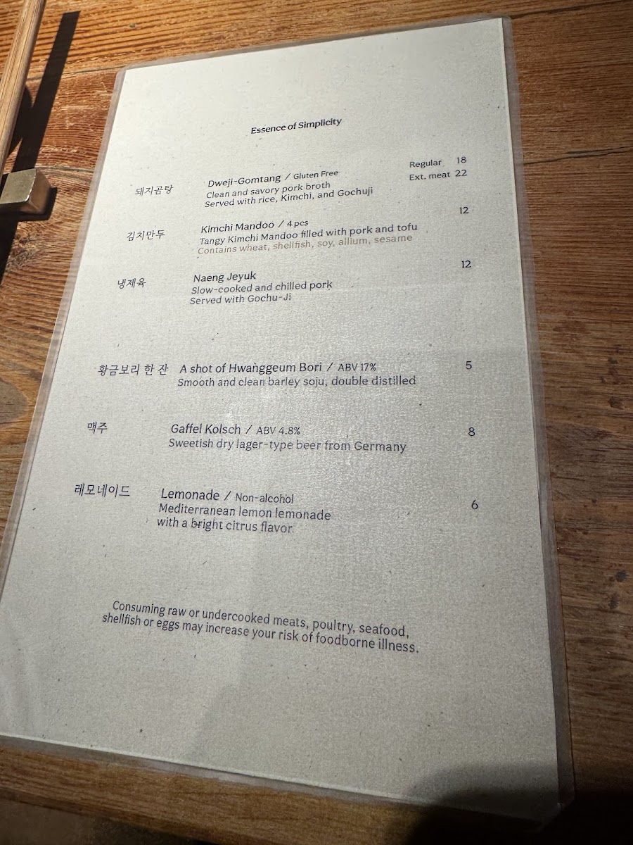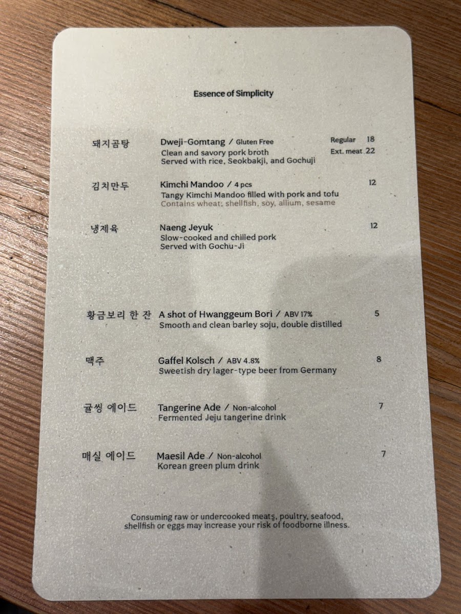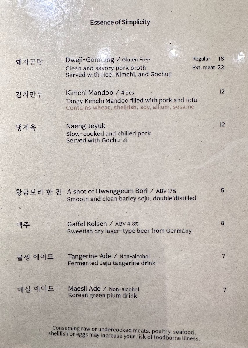 Clean and savory pork broth with abundant vegetal aromas. Served with rice, sliced pork, Geotjeori, and Gochu-Ji. [Gluten-free]