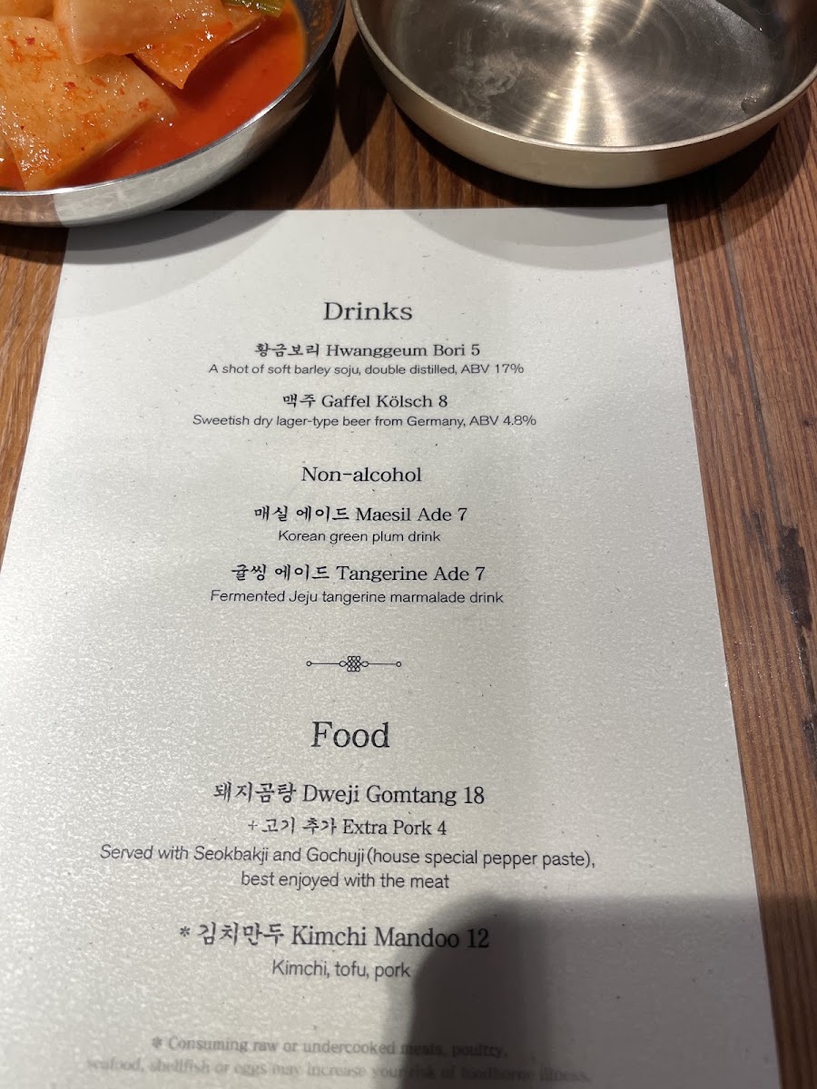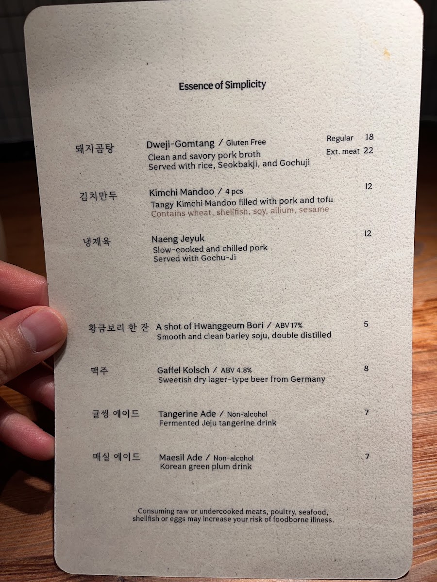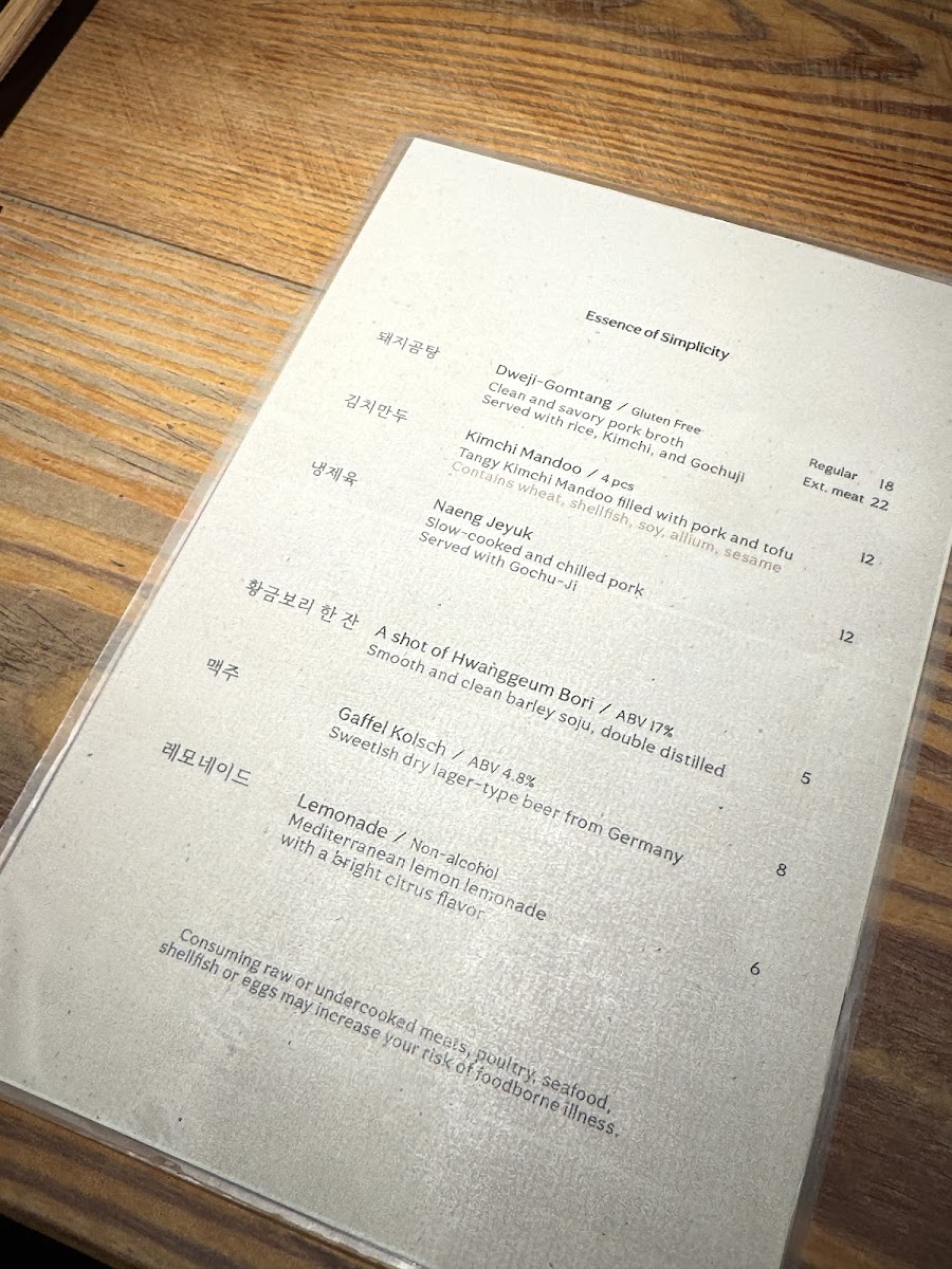 Clean and savory pork broth with abundant vegetal aromas. Served with rice, sliced pork, Geotjeori, and Gochu-Ji. [Gluten-free]